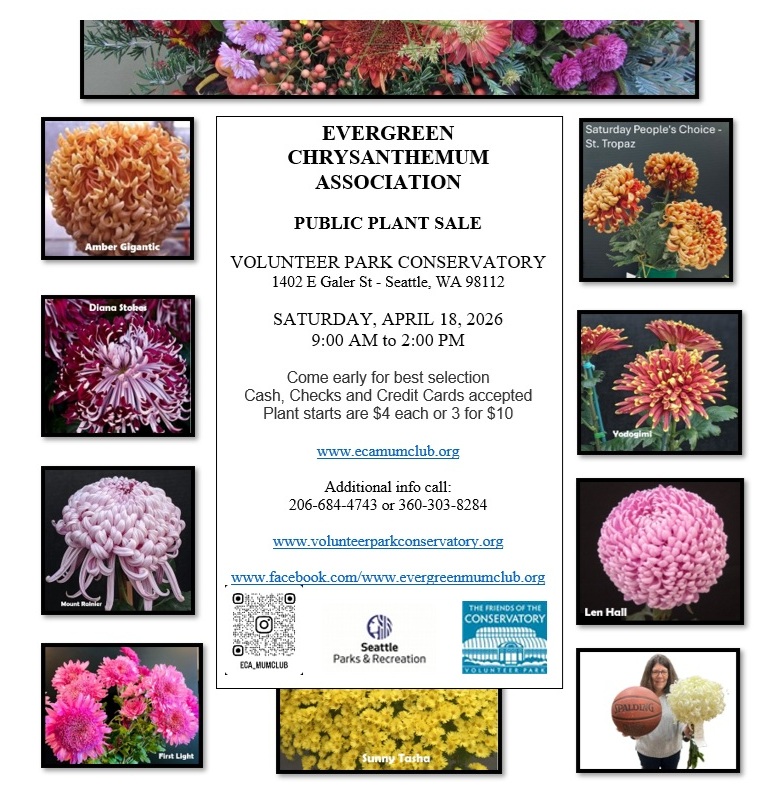 Thank you for your contact information and interest in Evergreen Chrysanthemum Association. Our next plant sale will be held on Saturday April 15, 2023. I have sent you an email regarding ECA membership. We look forward to hearing back from you.